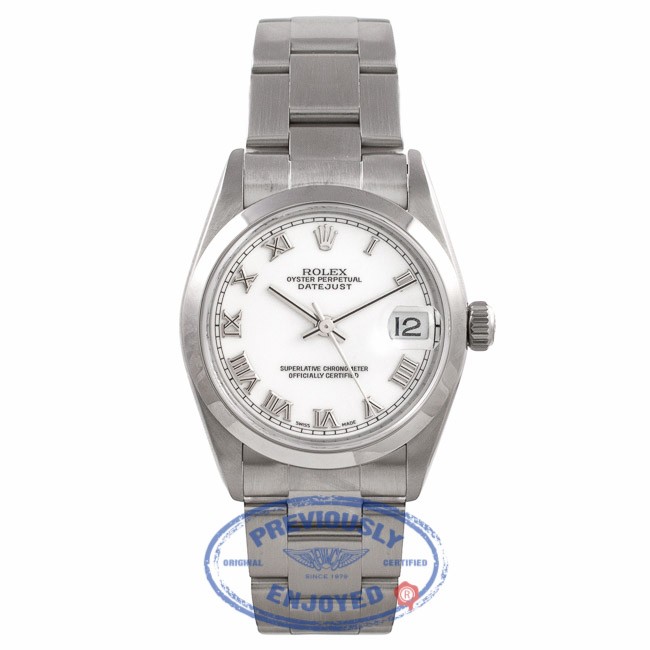Rolex Datejust 31MM Stainless Steel White Dial Roman Numerals Oyster Bracelet 78240 9Z9076 White dial with raised silver Roman numerals, sweep second hand and date indicator. Stainless steel smooth bezel, automatic movement. Oyster hidden clasp bracelet.