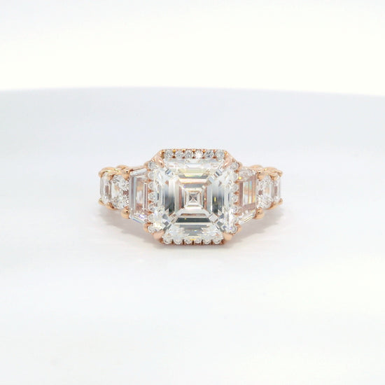 The Exclusive Beverly Hills Watch & Fine Jewelry Store since 1979. Fourth generation family jeweler, specializing in engagement rings, custom jewelry designs and loose diamonds. We are the specialist and your connection. 18K handcrafted custom designed diamond ring. The center diamond is an Asscher cut 4.51ct. Color - F Clarity - SI1 GIA graded and inscribed. The diamond is graded Excellent for Polish and Symmetry. The center diamond is surrounded by 26 brilliant cut micro set diamonds, shouldered with perfect matching pair of trapezoid diamonds weighing .86ct. total. The rest of the shank is set with10 matching Asscher cut GIA graded diamonds weighing 3.48cts. total.