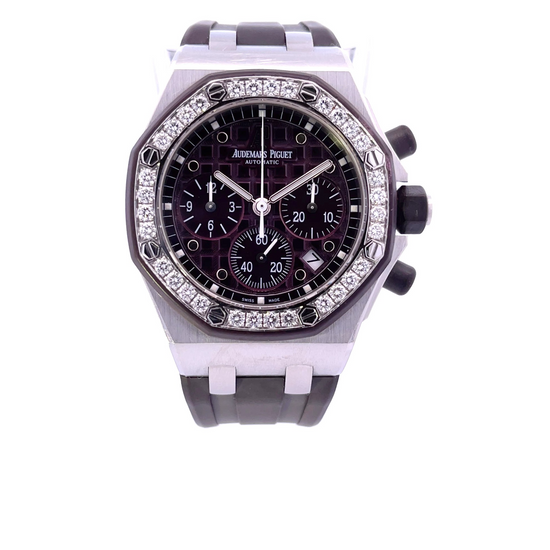 Audemars Piguet Royal Oak Offshore 37mm Purple Dial 26048SK.ZZ.D066CA.01 From the famous Royal Oak Offshore collection with the immediately recognizable hexagon design bezel secured by 8 steel screws. The exquisite features a brushed/satin finished stainless steel case. Distinctive plum/purple rubber-clad chronograph buttons, crown & gasket between the bezel & the case. Plum / purple colored "Waffle" design textured dial. Applied dot hour markers. Bezel set with 32 Top Wesselton VS Quality diamonds weighing approximately 1.25 carats. Luminous dot hour markers. Steel hands with luminous fill. Chronograph function: Large central seconds. 30-minute counter at the 3 o'clock position. 12-hour counter at the 9 o'clock position. Small seconds sub-dial at the 6 o'clock position. The date Window is located between the 4 & 5 o'clock positions. AP caliber 2385 beats at 21,600 vph & contains 37 jewels & has an approximate Power Reserve of 40 hours.