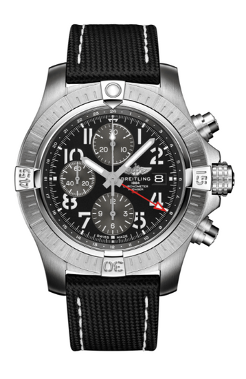 Breitling Avenger Chronograph GMT 45mm Black Dial A24315101B1X1 Silver-tone stainless steel case with an anthracite calfskin leather strap. Uni-directional rotating silver-tone stainless steel bezel. Black dial with silver-tone hands and index-Arabic numeral hour markers. Minute markers around the outer rim. Dial Type: Analog. Luminescent hands and markers. Date display at the 3 o'clock position. Chronograph - three sub-dials displaying: 60 second, 30 minute and 12 hour. Breitling Calibre 24 Automatic movement, based upon ETA 7754, containing 25 Jewels, bitting at 28800 vph, and has a power reserve of approximately 42 hours. Scratch-resistant sapphire crystal.