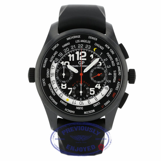 Girard Perregaux WW.TC Shadow Flyback Chronograph 43MM Ceramic Titanium Black Dial Black Rubber Strap 49820-32-611-FK6A This watch is Previously Enjoyed and comes complete with its original Girard Perregaux packaging. Watch has minimal wear, the strap was sized down and should fit up to a 7 1/2 inch wrist. This watch is out of warranty. This watch is in excellent working order.