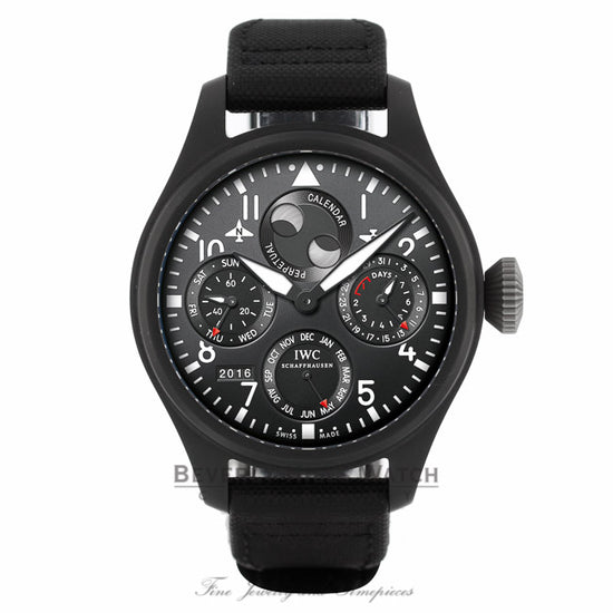 IWC Big Pilot Perpetual Calendar Ceramic 48mm Case and Titanium Watch IW5029.02 RM5CNL This watch has never been sized or worn. Watch comes complete with IWC packaging, manual and certificate of authenticity. International two year factory warranty. Beverly Hills Watch Company. Beverly Hills Watch Company is not an authorized IWC retailer and anyway affiliated with IWC.
