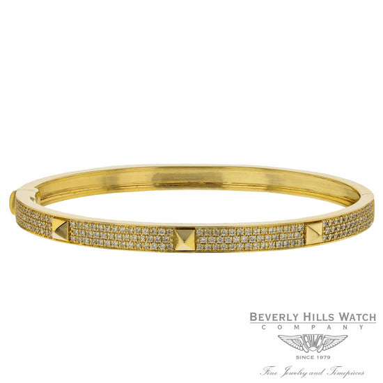 The Exclusive Beverly Hills Watch & Fine Jewelry Store since 1979. Fourth generation family jeweler, specializing in engagement rings, custom jewelry designs and loose diamonds. We are the specialist and your connection. Naira & C Poosh Bangle Bracelet Yellow Gold and Diamonds 3UDMKT Made in solid 14K rose gold with a total of .98t carats of diamonds in three row. The studs are made of solid 14K rose gold. Push to open security clasp.