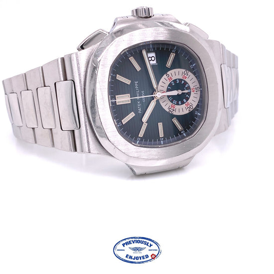 Patek Philippe Nautilus Chronograph Blue Dial Stainless Steel 5980/1a-001 This watch is Previously Enjoyed and comes complete with its original Patek Philippe packaging, manuals, and archive papers. This watch was purchased new in November 2007. This watch is missing two links. This watch has never been serviced or refinished. This watch is in good working order.